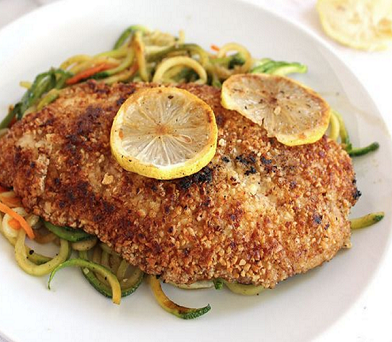 Dress plates with zucchini noodles, then almond crusted chicken. Garnish with lemon slices.