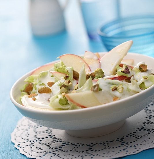 Wash the apple and cut it into slices. Mix the apple slices with lemon juice. Chop lettuce into pieces and mix with apple slices, dried raisins, American pistachio kernels, yogurt, and honey.