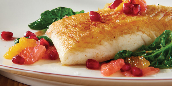 Halibut with Wilted Spinach & POM–Citrus Vinaigrette