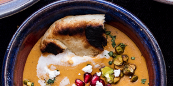Moroccan Butternut Squash and Goat Cheese Soup w/Coconut Ginger Cream, Pomegranates, and Pistachios
