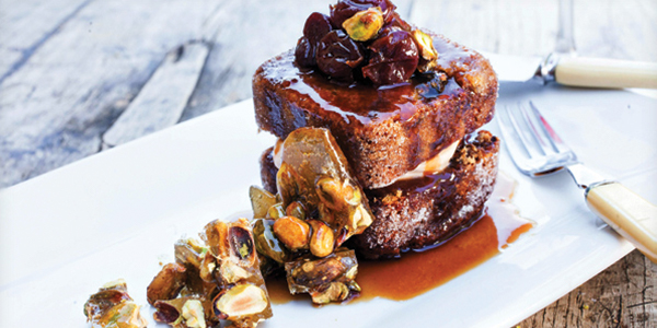 Pistachio Cakes with Cherry Rum Sauce & Pistachio Brittle