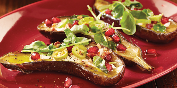 Roasted Eggplant With POM, Pickled Chilies & Pecans